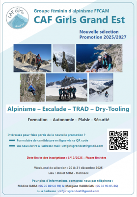 L'idée est de regrouper des filles motivées et compétentes pour créer une dynamique de groupe, et ainsi engendrer des projets singuliers qui valorisent l'image de la femme dans la pratique de l'alpinisme (expérience, performance, prise d'initiative, etc.). La FFCAM et le Comité Régional mettront les moyens financiers et humains pour accompagner au mieux le fonctionnement du groupe. Ce groupe constitué de 6 filles devra participer à la vie fédérale (rassemblements, projets de formations fédérales, sorties clubs) et valorisera l'autonomie et la prise d'initiative.
