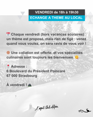 Le club vous propose un accueil les vendredis soirs au local de 18h à 19h30 (hors vacances scolaires) pour des moments d'échanges et de convivialité.